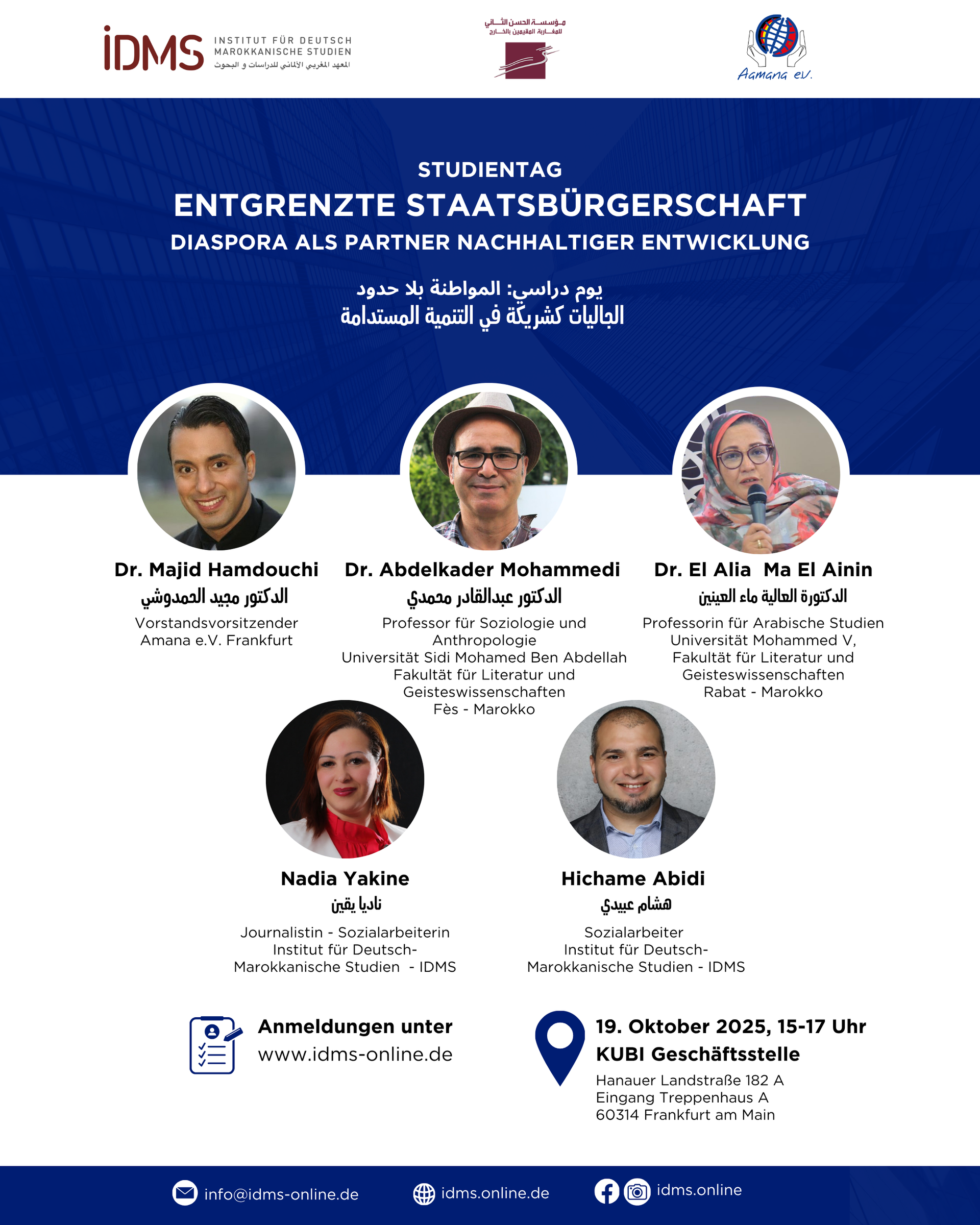 einerseits mit Fragen zur nachhaltigen gesellschaftlichen Entwicklung in Marokko beschäftigt und andererseits mit den Lebensrealität der marokkanisch-stämmigen Community in Deutschland. Das IDMS versteht sich explizit als Brücke zwischen Deutschland und Marokko und möchte hier neue Ideen und wichtige Impulse im wissenschaftlichen Austausch einbringen. Dazu erstellt und akkumuliert das IDMS Studien, Expertisen und Hintergrundpapiere, bereitet eine Downloadplattform für den Wissenstransfer und führt Veranstaltungen durch.